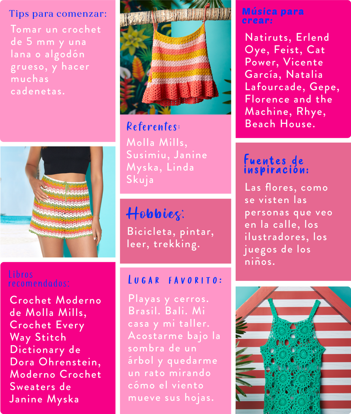 en nuestras casas, luego a importar materiales novedosos, colaborar con marcas, tener tienda online, invitar a grandes diseñadoras de crochet a nivel mundial, hacer pícnics de tejido... hasta que llego la pandemia y al fin tuve la oportunidad de volcar todo eso en un mundo online y conectar con más personas del mundo. Fui madre y la falta de tiempo, sumado a una depresión postparto, me llevaron a sincerarme y enfocarme en lo que amo de todo esto: enseñar, no dependen de un lugar físico, y enfocarme en el crochet. Así el proyecto dejó de llamarse La Tejería para mi alter ego de hoy: Javi Hook, profesora y diseñadora de crochet. Actualmente, hago diferentes cursos online, lidero la membresía Club del Crochet, organizo viajes textiles y asesoro a emprendedoras que quieren crear o crecer con su marca de oficios. Lo que más amo es crear experiencias para que todos disfrutemos del tejido.