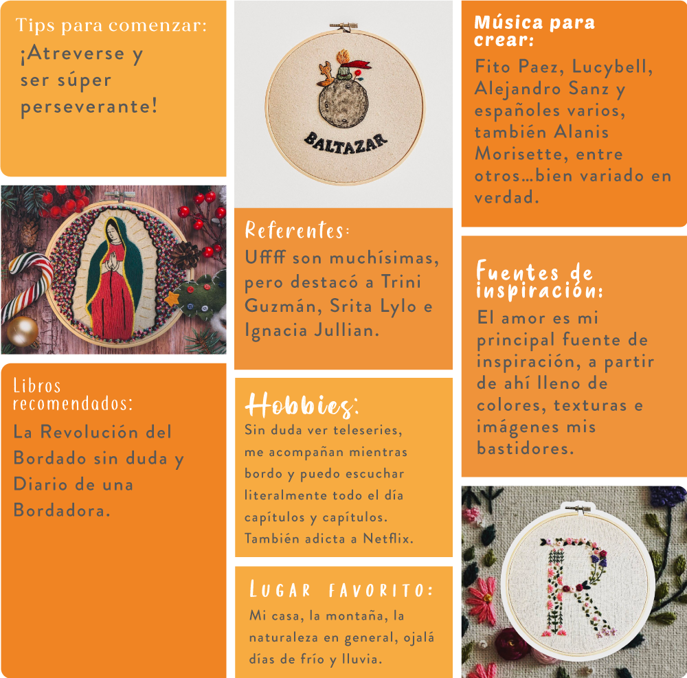 Soy María Jesús, más conocida como la Jesu. Ingeniero comercial de profesión, casada hace 14 años y con dos hijos de 12 (Pelayo) y 10 años (Colomba). Siempre estuve encantada y enamorada del bordado, primero punto cruz, el cual conocí gracias a mi mamá, quien me hizo clases de técnico manual, asignatura que casi ya no existe, pero que sí o sí debería volver. A pesar de estar siempre ligada a este maravilloso arte, me dediqué durante 14 años a mi profesión y durante la pandemia me reencontré con mi gran pasión, me especialicé aún más y me lancé con clases y bordados a pedido. Para mí bordar, además de llenarme el corazón, se ha transformado en una terapia sanadora que sueño compartir con miles de personas y formar una gran comunidad entre hilos y colores.