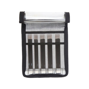 Set de 25 palillos de doble punta Karbonz empaquetados en un atractivo estuche de tela negra y gris, con vinilo transparente. Son 5 palillos de cada medida para que puedas tejer en circular todos los proyectos que tengas en mente.